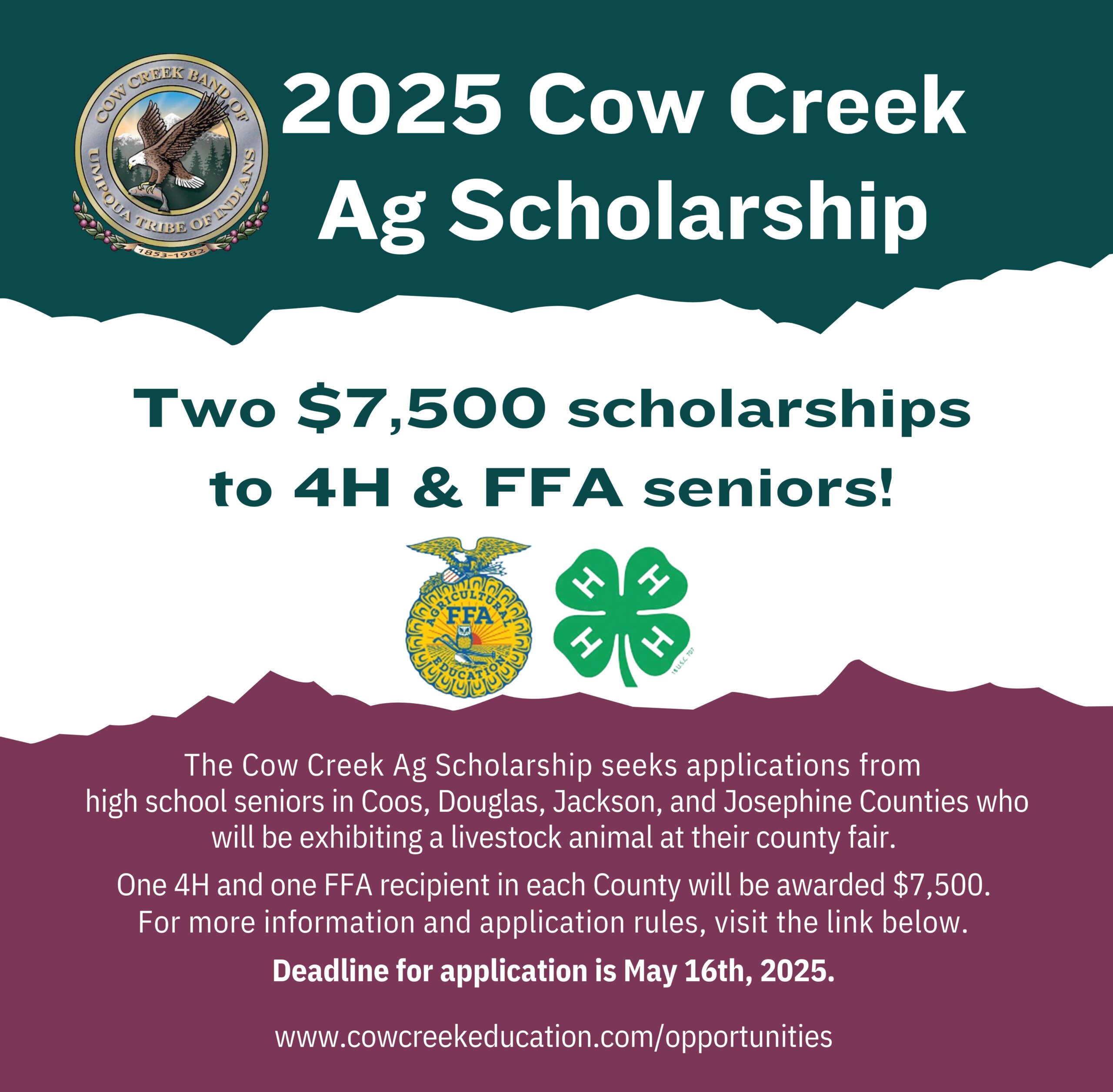 Seniors in high school and residents of Douglas, Jackson, and Josephine Counties, exhibiting a livestock animal (cattle, hogs, sheep, goats, rabbits, poultry) in 4-H or FFA at their respective 2025 county fairs.